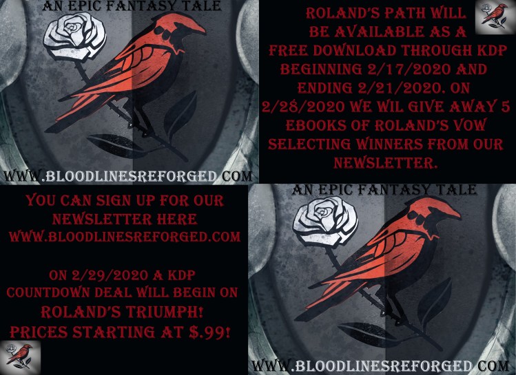 Roland’s Path will be available as a FREE download through KDP (aka Kindle) beginning Monday, 2/17/2020, through Friday, 2/21/2020! On 2/28/2020 We’ll be drawing from our newsletter subscribers to give away FIVE eBooks of Roland’s Vow. On 2/29/2020 a KDP countdown deal will begin on Roland’s Triumph with a starting price of just $.99! Keep an eye out here for more news, discounts, and giveaways! As always, ‘Crush Your Enemies!’